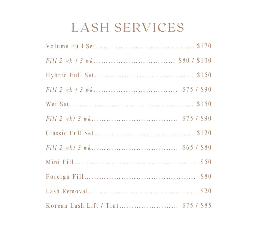 Wake up to effortlessly bold, full, and fluffy lashes — no mascara needed! Lash extensions are tailored to your style - from classic, hybrid, to volume. They blend seamlessly to your natural lashes leaving you with effortless volume and length.Lash lifts on the other hand can help enhance your natural by giving them a beautiful upward curl and tint to deepen that color. Say goodbye to lash curlers that damage your hair and say hello to low-maintenance beauty with maximum impact.Price list below.
